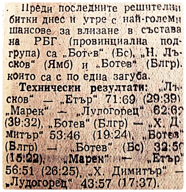 Срещу сливенския "Х. Димитър" ямболският отбор изиграва един перфектен мач. Първото полувреме играем великолепно в защита и позволяваме да ни отбележат едва 14 точки. Почивката идва при резултата 27:14. Успокоени и уверени във възможностите си нашите недопускат обрат и печелят с 48:40. Радостта е неописуема. Отборът ни заема второто място в крайното класиране и с това правото да играе в "А" РБГ /провинциална/.