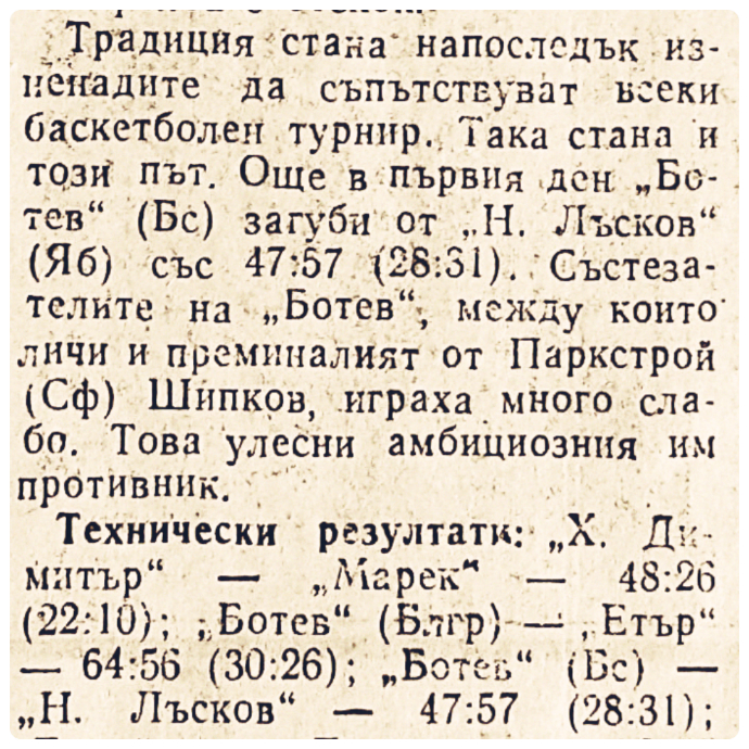 В първият ден на турнира „Н.Лъсков“ има за съперник считаният за най-силен отбор на турнира бургаския „Ботев“. Бургазлии са подсилени от много силен състезател от софийският Паркстрой – участник в „А“ РБГ /столична/. „Ботев“ / Бургас/ са и отборът, който през изминалия сезон се е състезавал в провинциалната „А“ група. Класен и много по-реномиран отбор от всички други кандидати за елита. Още в този първи мач ямболският отбор поднася голямата изненада като побеждава бургазлии с цели десет точки разлика – 57:47. Отборът ни води на полувремето с 31:28. Всички в залата очакват закономерен обрат в резултата, но той не се случва. Амбициозните ямболци не се дават и напълно заслужено печелят срещу фаворита.