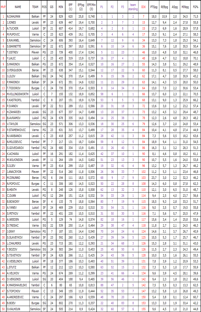 РАНГЛИСТА НА ПЪРВИТЕ ПЕТДЕСЕТ БАСКЕТБОЛИСТИ В НБЛ СЛЕД КРАЯ НА РЕДОВНИЯ СЕЗОН 2013-2014