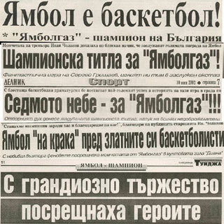 С тези заглавия излязоха ямболските вестници веднага след спечелването на историческата първа шампионска титла за мъжкият баскетболен отбор на Ямбол. Единствената в колективните спортове за града ни. Еуфорията сред привържениците ни бе неописуема. Стотици посрещнаха шампионите посред нощ пред „Безистена”. Шампанското се лееше навред. Собствениците на заведения щедро черпеха с бира и твърд алкохол. На следващият ден, в препълнената както винаги фамозна Диана Арена заедно празнуваха героите-шампиони и техните верни фенове. Големите на деня се спукаха от хвалебствени слова и обещания към треньори и играчи. Спечелването на 60-то Държавно първенство беше обявено за събитието на 2002 за Ямбол, а датата 6 юни за една от най-значимите в новата история на града, чийто символ е богинята на лова и плодородието Диана.