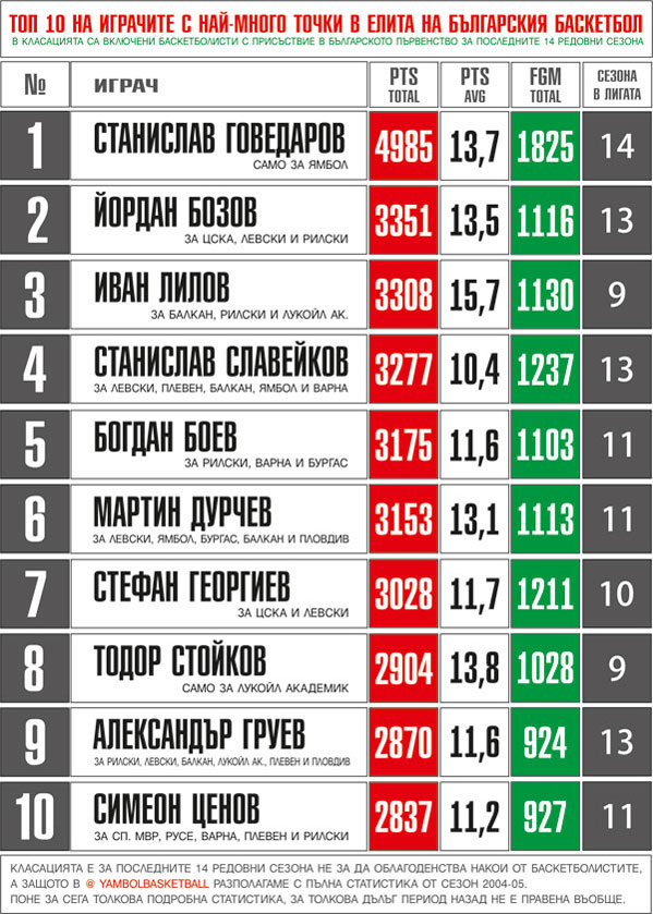 Представяме ви статистическа информация за баскетболистите играли в българското първенство през последните 14 редовни сезона (2004-18). Подобна обобщена информация, толкова далеч във времето, поне за сега няма да намерите никъде другаде.