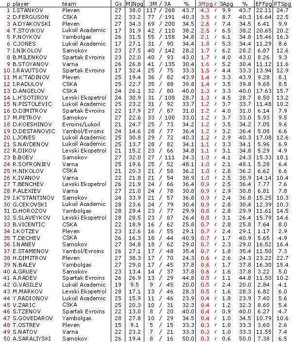 В ранглистата са включени баскетболисти взели участие поне в 50 % от мачовете на своите отбори