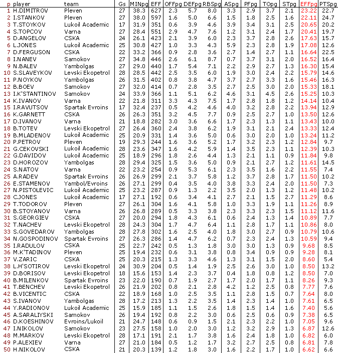 В ранглистата са включени баскетболисти взели участие поне в 50 % от мачовете на своите отбори.