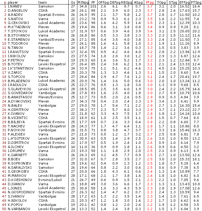 В ранглистата са включени баскетболисти взели участие поне в 50 % от мачовете на своите отбори