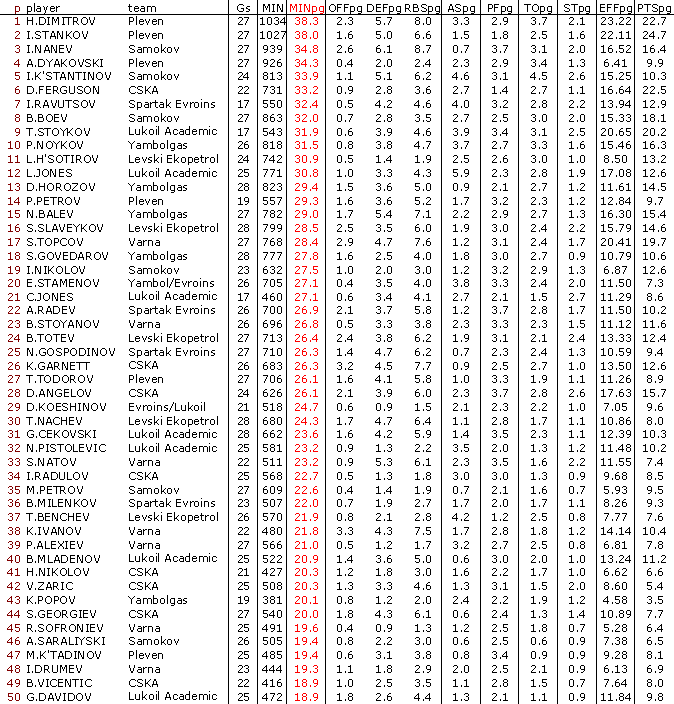 В ранглистата са включени баскетболисти взели участие поне в 50 % от мачовете на своите отбори