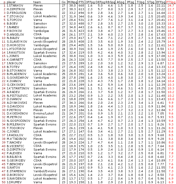 В ранглистата са включени баскетболисти взели участие поне в 50 % от мачовете на своите отбори
