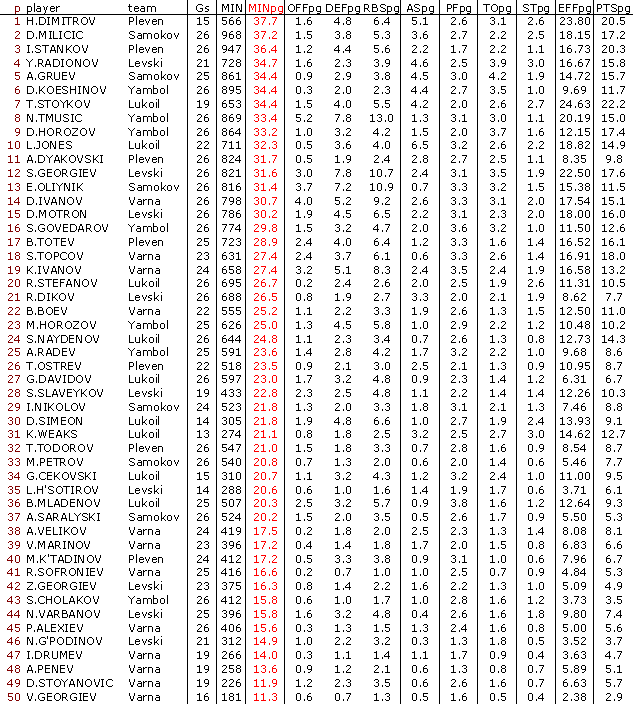 В ранглистата са включени баскетболисти взели участие поне в 50 % от мачовете на своите отбори