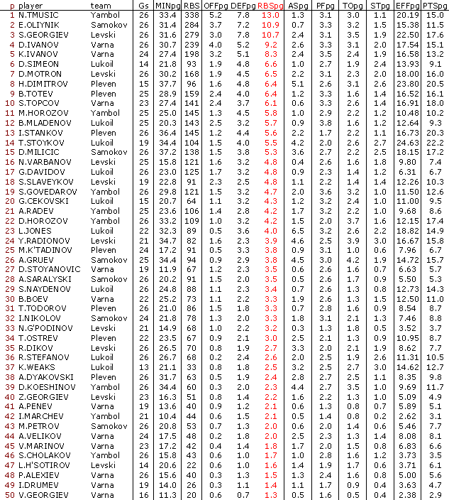 В ранглистата са включени баскетболисти взели участие поне в 50 % от мачовете на своите отбори