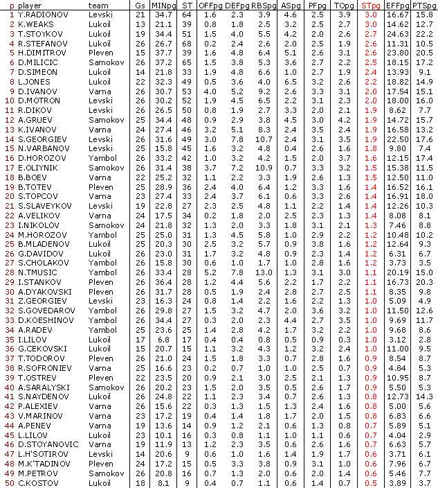 В ранглистата са включени баскетболисти взели участие поне в 50 % от мачовете на своите отбори
