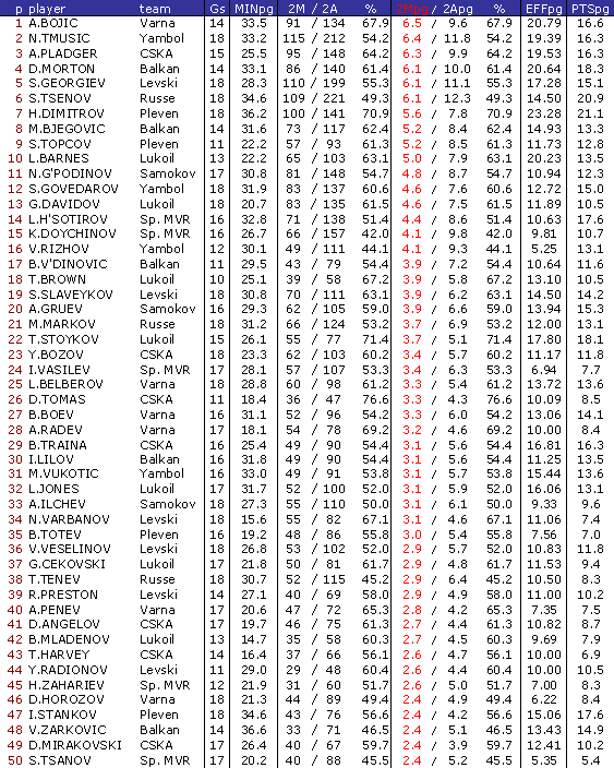 В ранглистата са включени баскетболисти взели участие поне в 50 % от мачовете на своите отбори