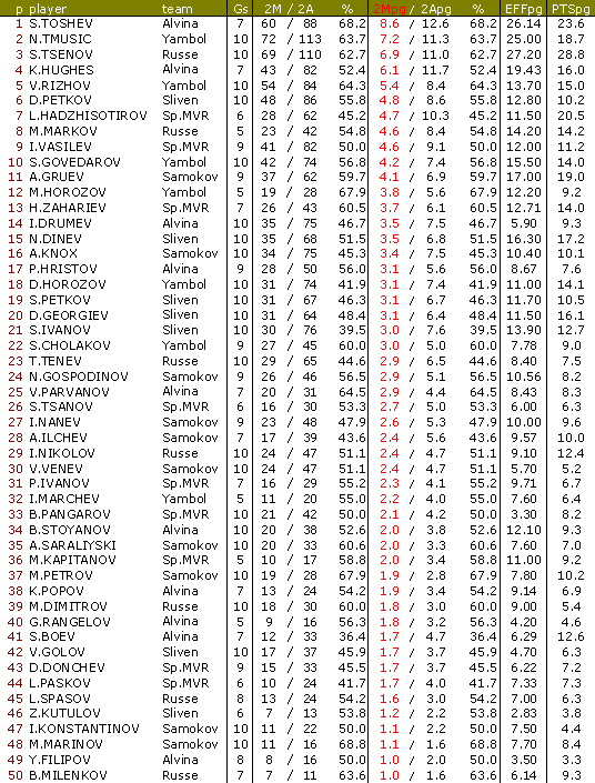 В ранглистата са включени баскетболисти взели участие поне в 50 % от мачовете на своите отбори в първата фаза /десет отбора/ и във втора А-1