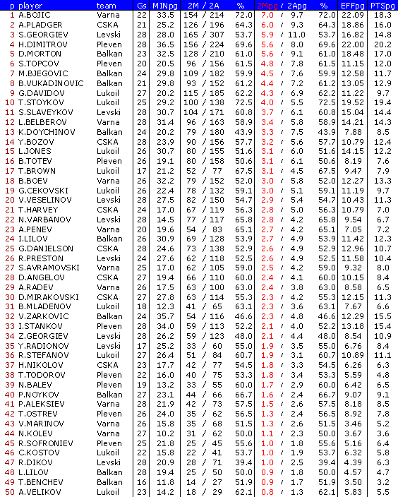 В ранглистата са включени баскетболисти взели участие поне в 50 % от мачовете на своите отбори в първата фаза /десет отбора/ и в първа А-1