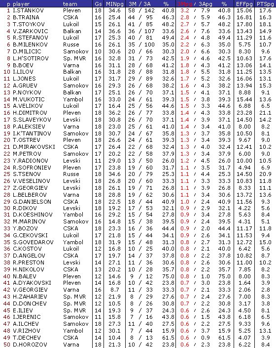 В ранглистата са включени баскетболисти взели участие поне в 50 % от мачовете на своите отбори