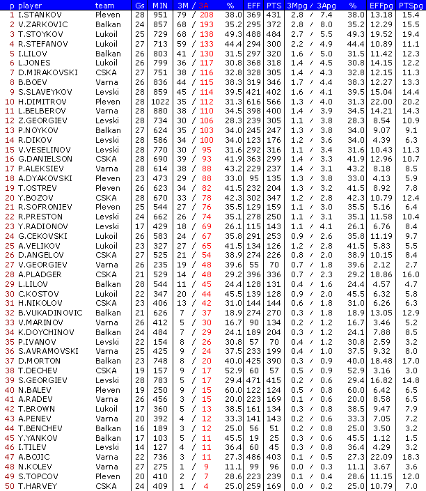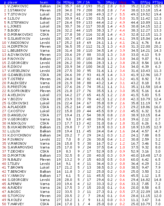 В ранглистата са включени баскетболисти взели участие поне в 50 % от мачовете на своите отбори в първата фаза /десет отбора/ и в първа А-1