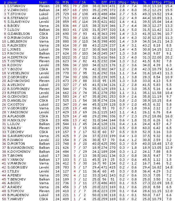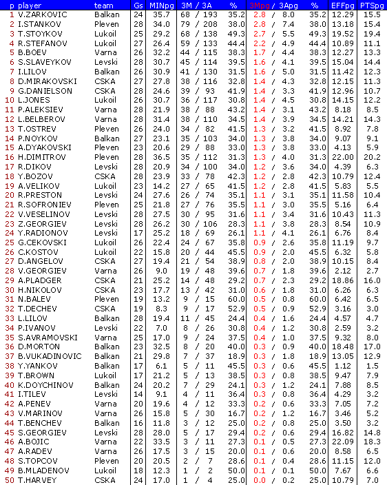 В ранглистата са включени баскетболисти взели участие поне в 50 % от мачовете на своите отбори в първата фаза /десет отбора/ и в първа А-1