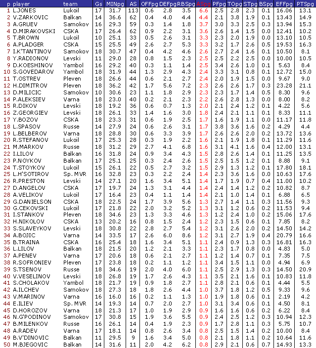В ранглистата са включени баскетболисти взели участие поне в 50 % от мачовете на своите отбори