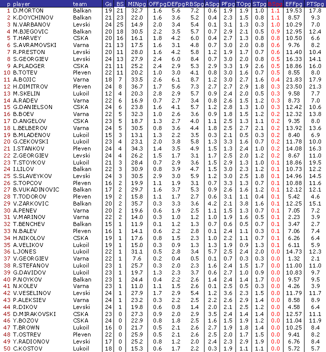 В ранглистата са включени баскетболисти взели участие поне в 50 % от мачовете на своите отбори