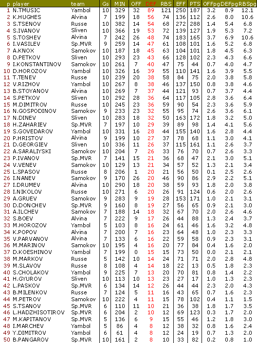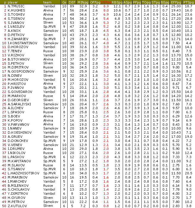 В ранглистата са включени баскетболисти взели участие поне в 50 % от мачовете на своите отбори в първата фаза /десет отбора/ и във втора А-1