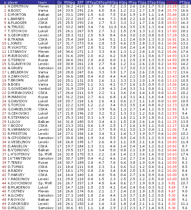 В ранглистата са включени баскетболисти взели участие поне в 50 % от мачовете на своите отбори
