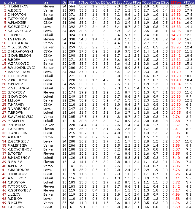 В ранглистата са включени баскетболисти взели участие поне в 50 % от мачовете на своите отбори