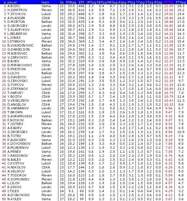 В ранглистата са включени баскетболисти взели участие поне в 50 % от мачовете на своите отбори в първата фаза /десет отбора/ и в първа А-1