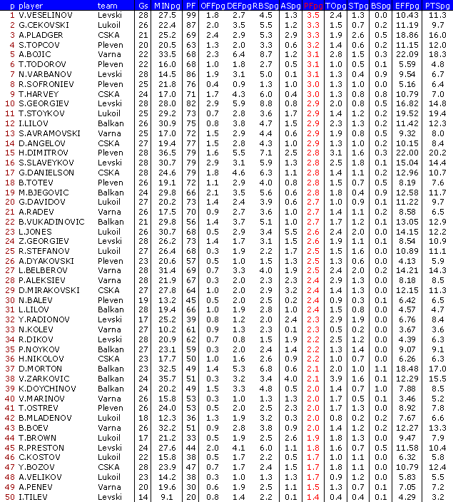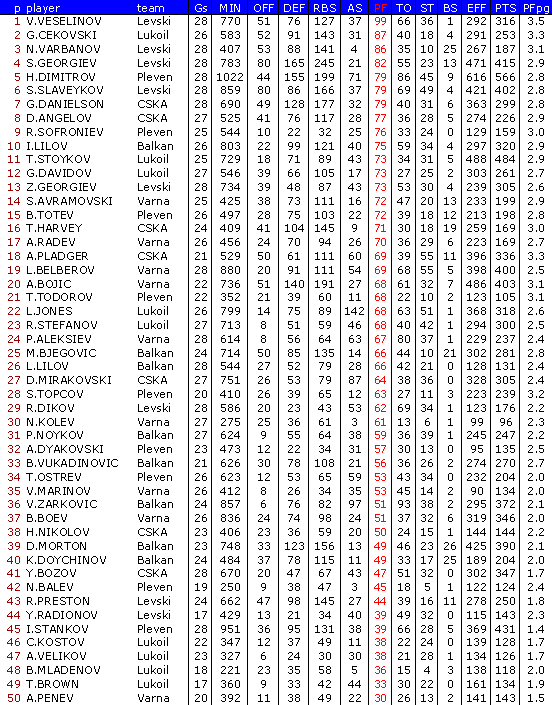 В ранглистата са включени баскетболисти взели участие поне в 50 % от мачовете на своите отбори в първата фаза /десет отбора/ и в първа А-1