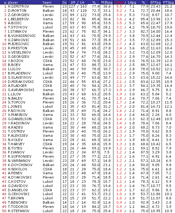 В ранглистата са включени баскетболисти взели участие поне в 50 % от мачовете на своите отбори
