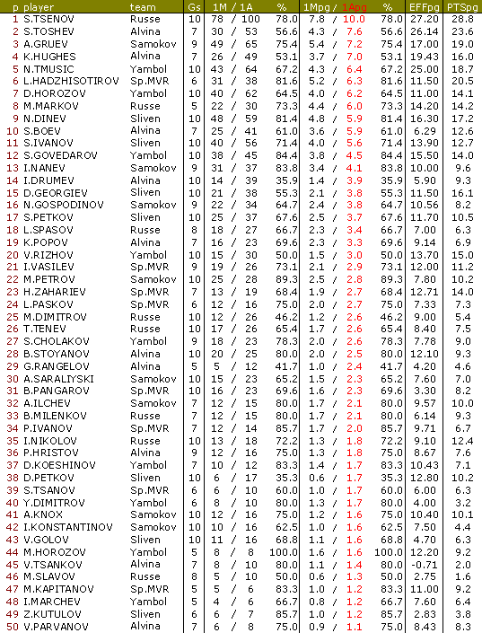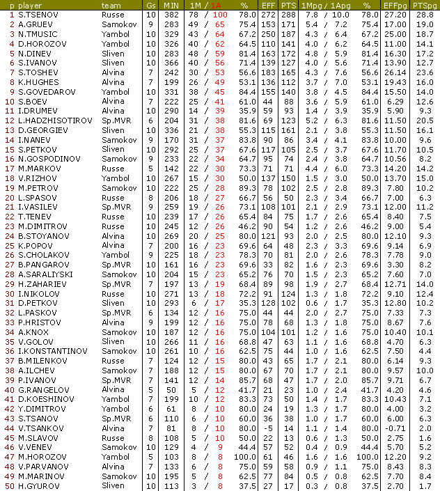 В ранглистата са включени баскетболисти взели участие поне в 50 % от мачовете на своите отбори в първата фаза /десет отбора/ и във втора А-1