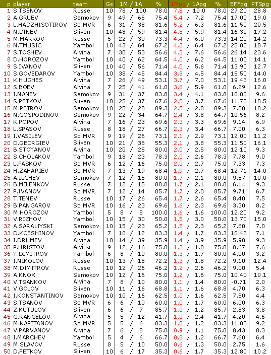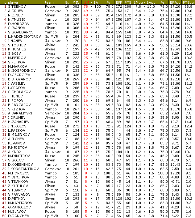 В ранглистата са включени баскетболисти взели участие поне в 50 % от мачовете на своите отбори в първата фаза /десет отбора/ и във втора А-1