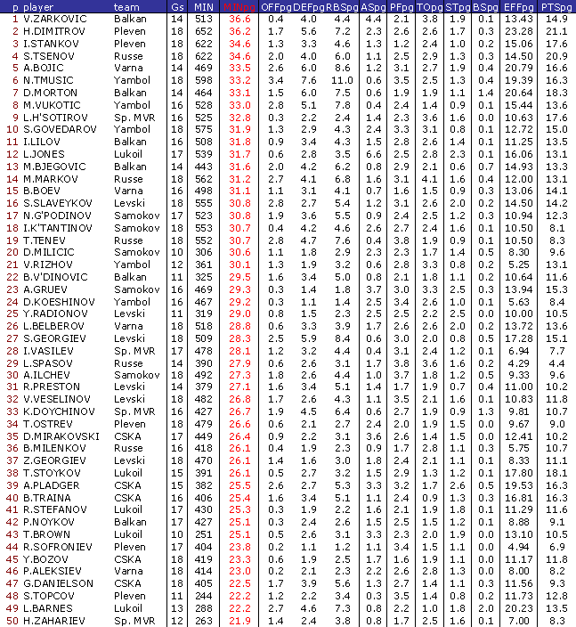 В ранглистата са включени баскетболисти взели участие поне в 50 % от мачовете на своите отбори