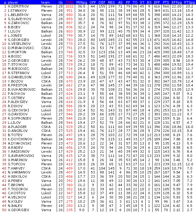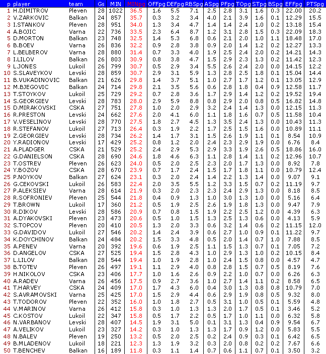 В ранглистата са включени баскетболисти взели участие поне в 50 % от мачовете на своите отбори в първата фаза /десет отбора/ и в първа А-1