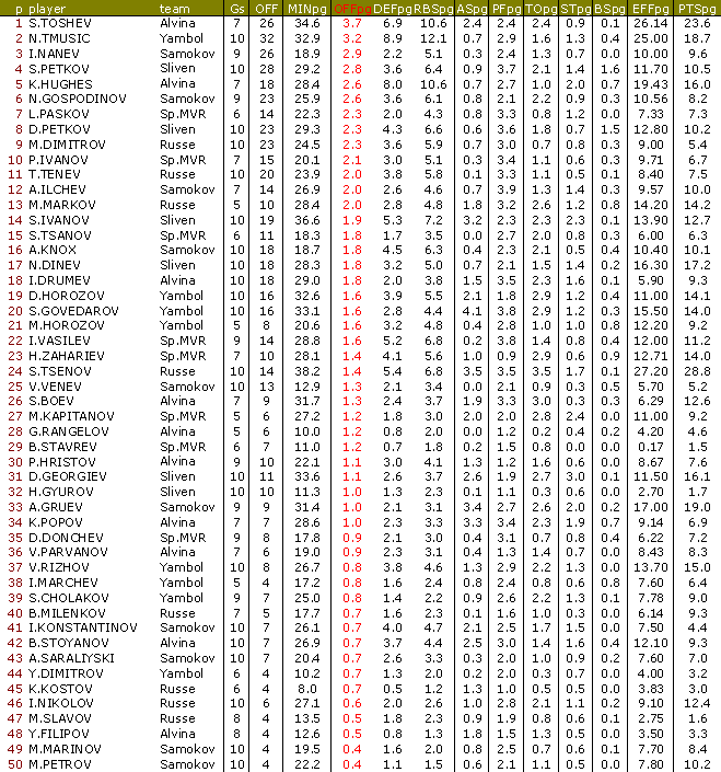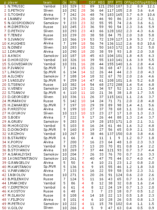 В ранглистата са включени баскетболисти взели участие поне в 50 % от мачовете на своите отбори в първата фаза /десет отбора/ и във втора А-1