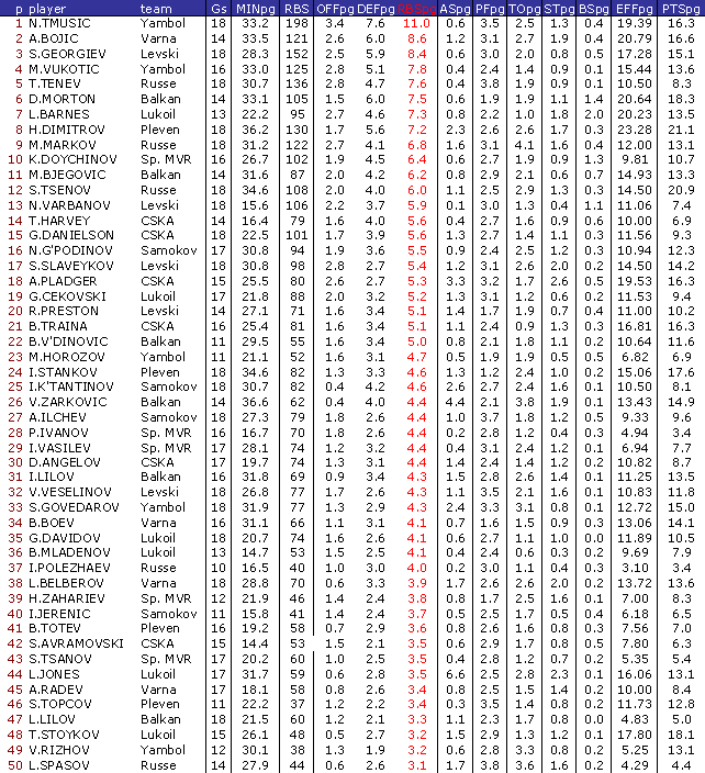 В ранглистата са включени баскетболисти взели участие поне в 50 % от мачовете на своите отбори