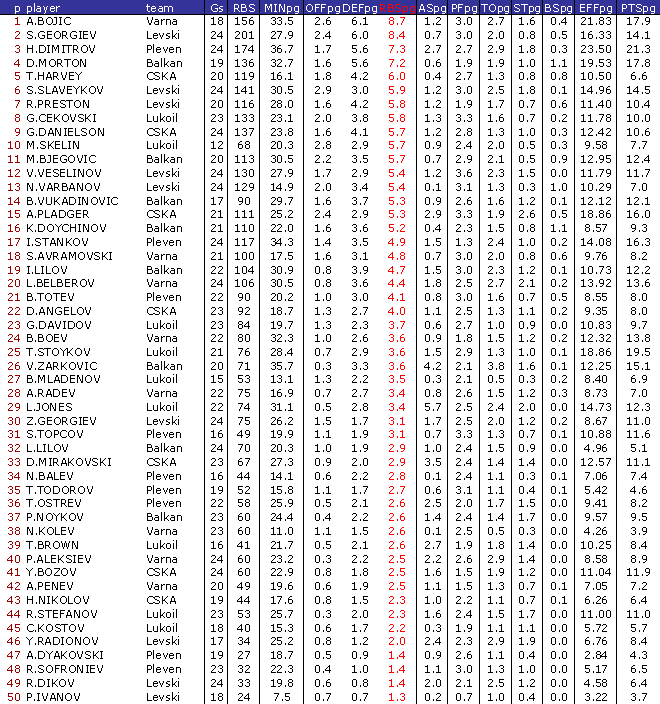 В ранглистата са включени баскетболисти взели участие поне в 50 % от мачовете на своите отбори