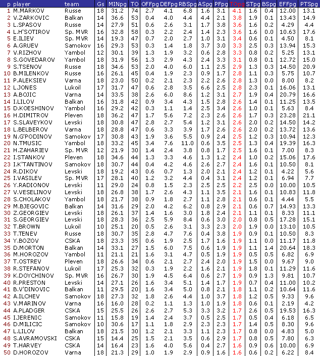 В ранглистата са включени баскетболисти взели участие поне в 50 % от мачовете на своите отбори