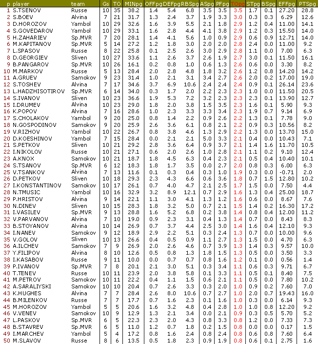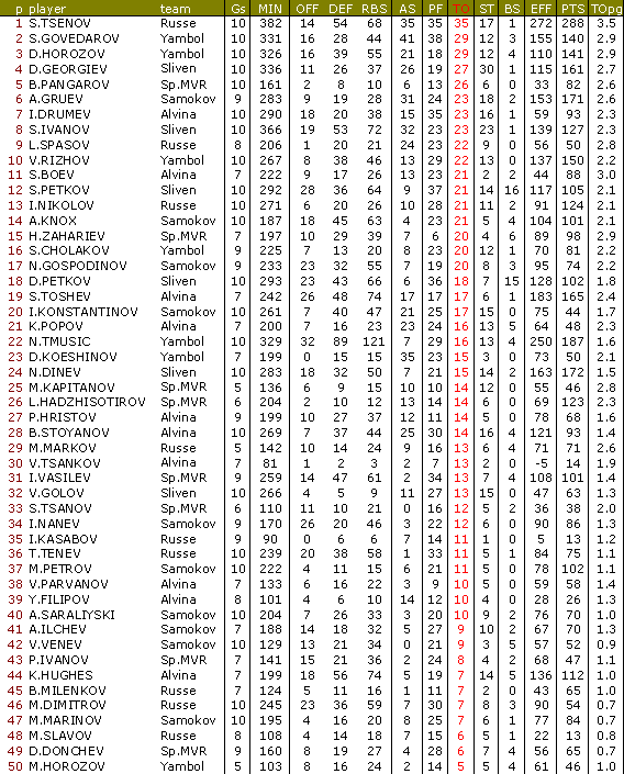 В ранглистата са включени баскетболисти взели участие поне в 50 % от мачовете на своите отбори в първата фаза /десет отбора/ и във втора А-1